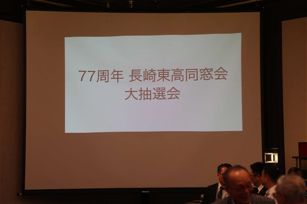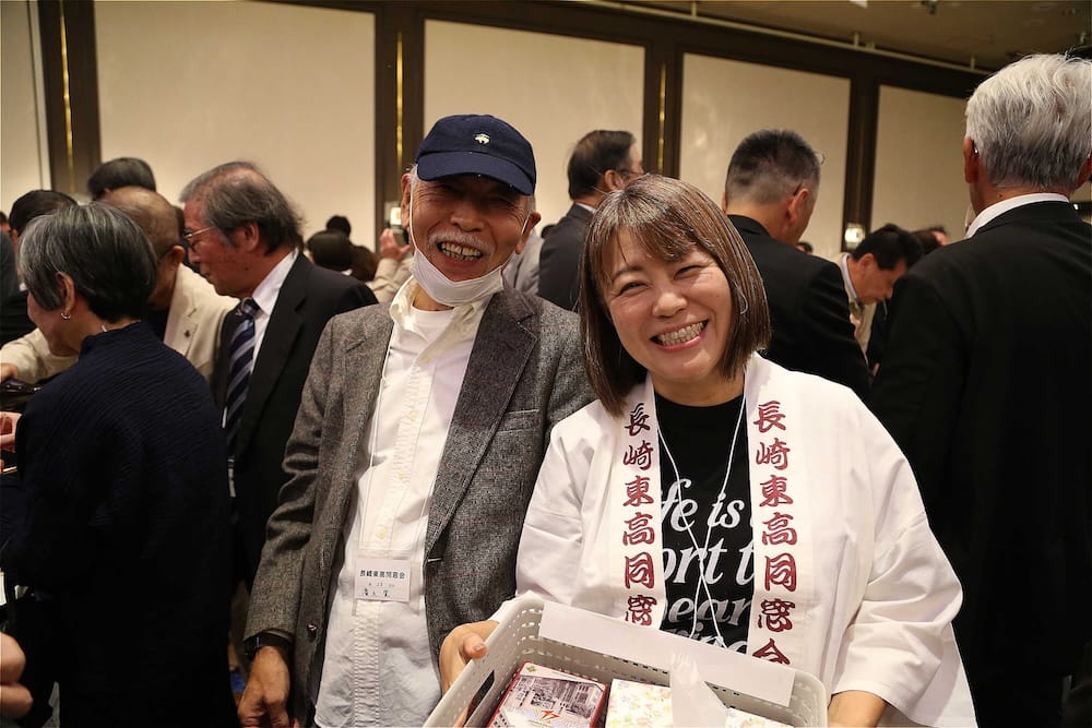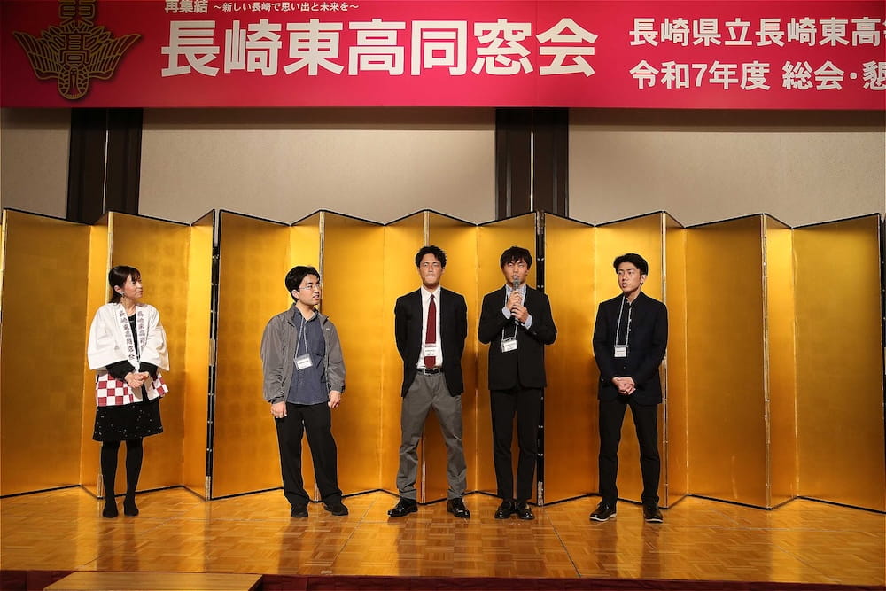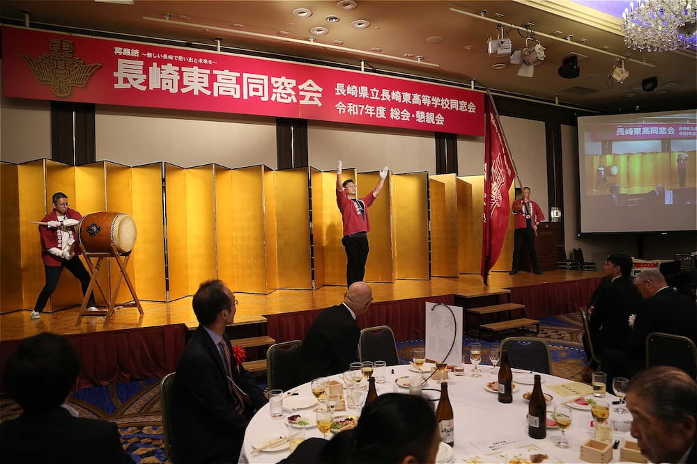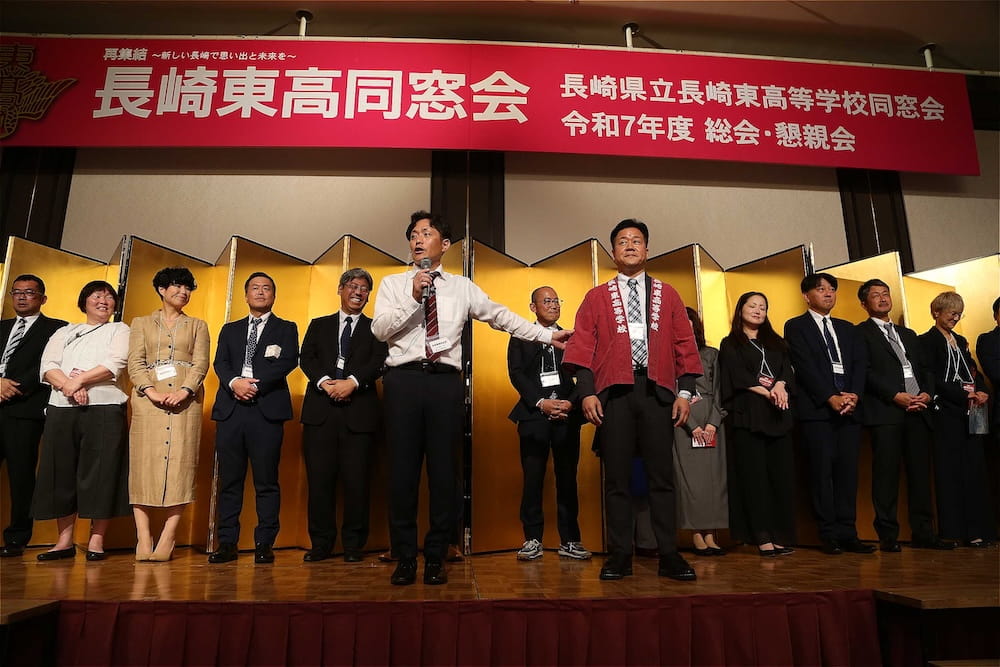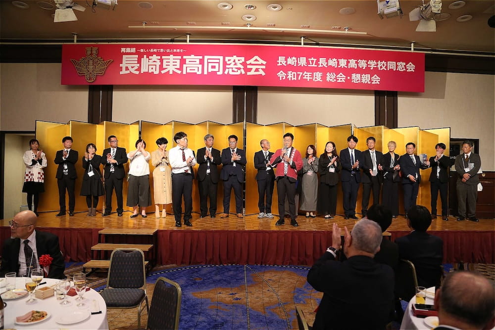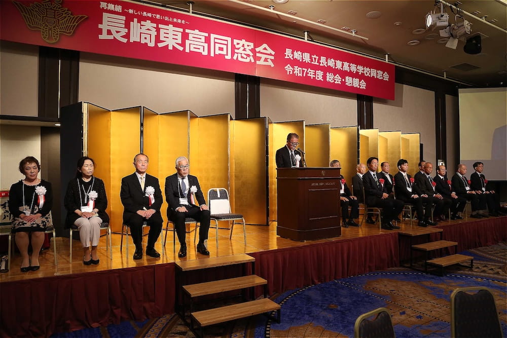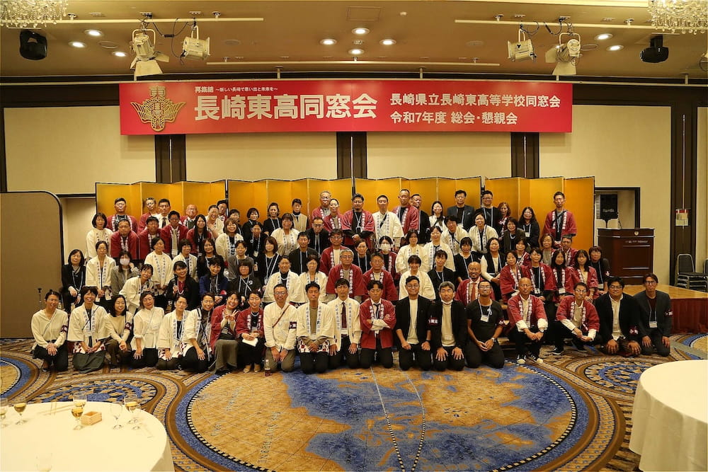 令和7年11月2日(日)13時から長崎市大黒町のホテルニュー長崎で、7年ぶりの東高同窓会総会・懇親会を開きました。平成30年11月の70周年記念同窓会総会・懇親会以降、コロナ禍で幾度となく延期を強いられましたがようやく開催の運びとなり、今回47回生・48回生が担当(実行委員長は47回生の早田知礼くん)しました。テーマに「再集結~新しい長崎で思い出と未来を~」を掲げ、全国から719人(速報値)が集結し、終始賑やかな同窓会となりました。恒例の部活動振興基金への支援(カンパ)では、抽選で食事券やホテル宿泊券が当たる企画が好評で準備した返礼品すべてがなくなり、90万円を超えるカンパが集まりました。