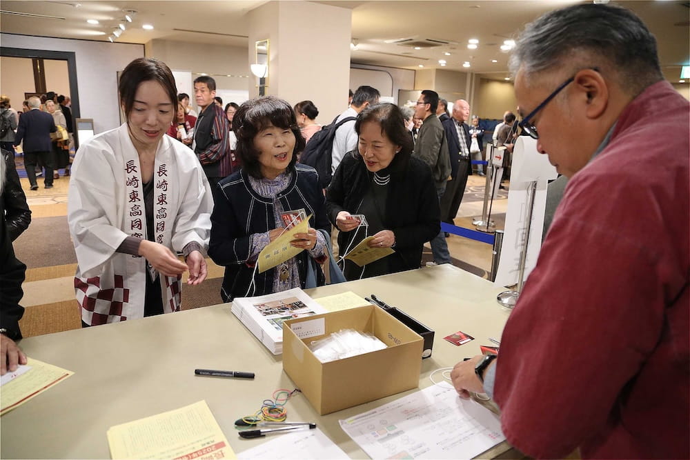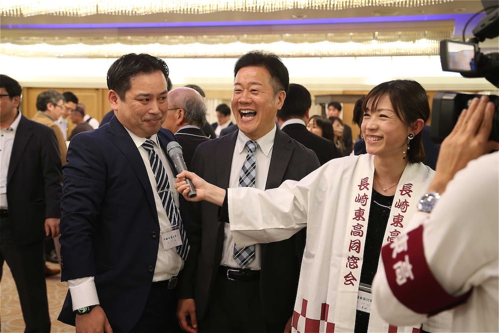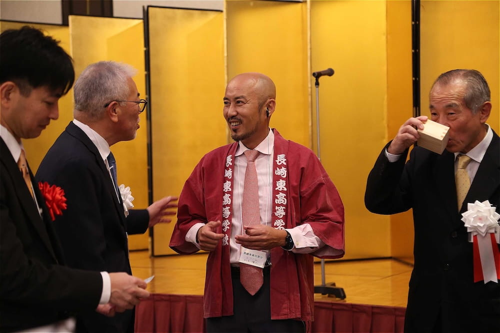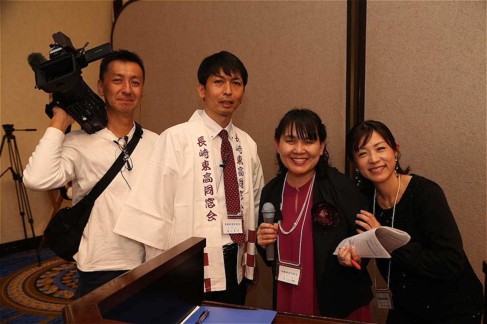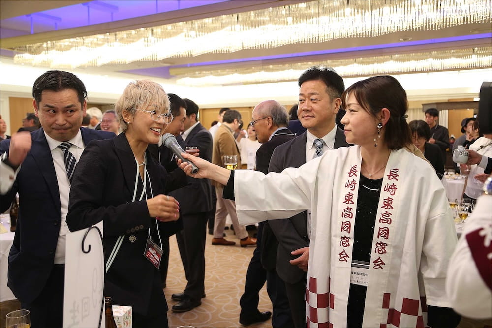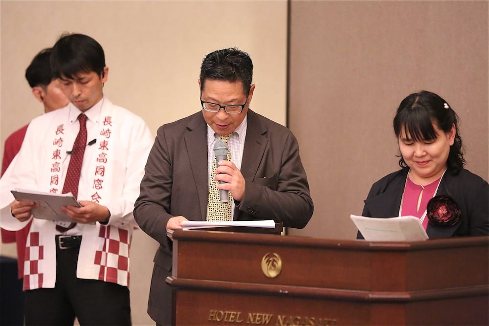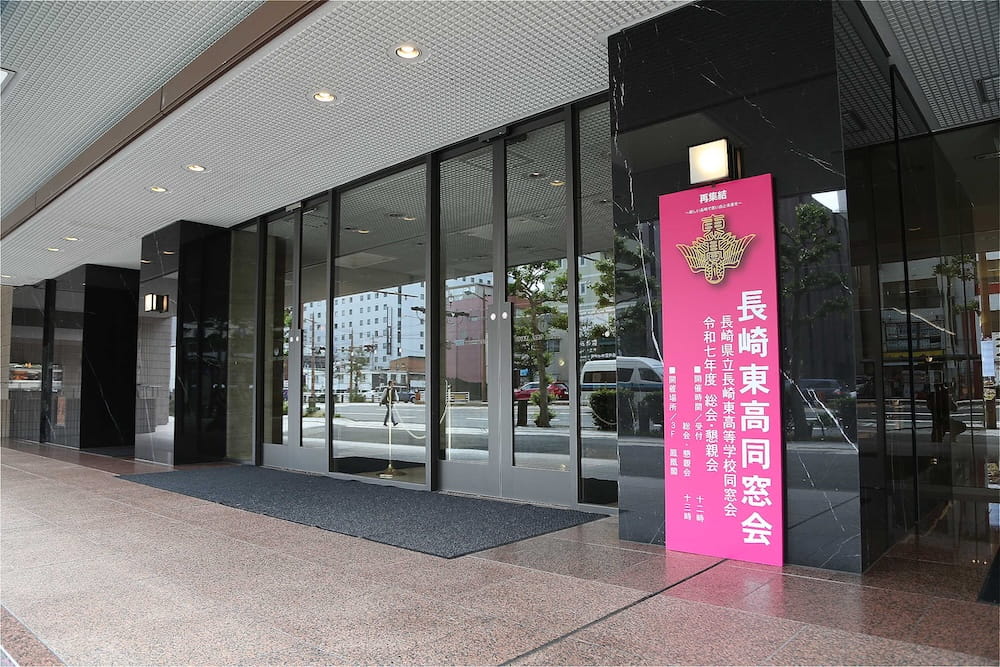令和7年11月2日(日)13時から長崎市大黒町のホテルニュー長崎で、7年ぶりの東高同窓会総会・懇親会を開きました。平成30年11月の70周年記念同窓会総会・懇親会以降、コロナ禍で幾度となく延期を強いられましたがようやく開催の運びとなり、今回47回生・48回生が担当(実行委員長は47回生の早田知礼くん)しました。テーマに「再集結~新しい長崎で思い出と未来を~」を掲げ、全国から719人(速報値)が集結し、終始賑やかな同窓会となりました。恒例の部活動振興基金への支援(カンパ)では、抽選で食事券やホテル宿泊券が当たる企画が好評で準備した返礼品すべてがなくなり、90万円を超えるカンパが集まりました。