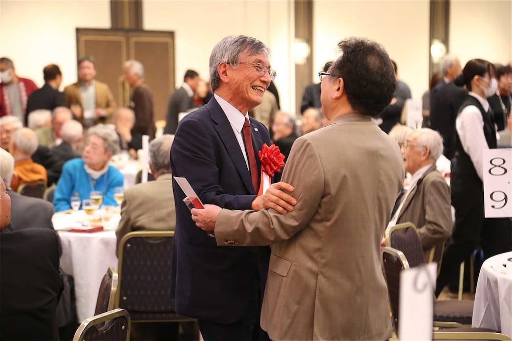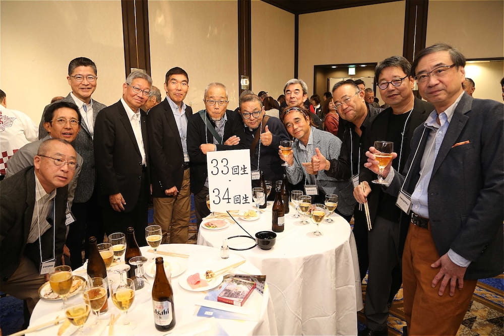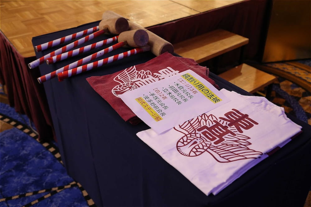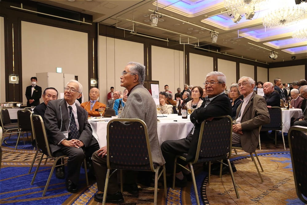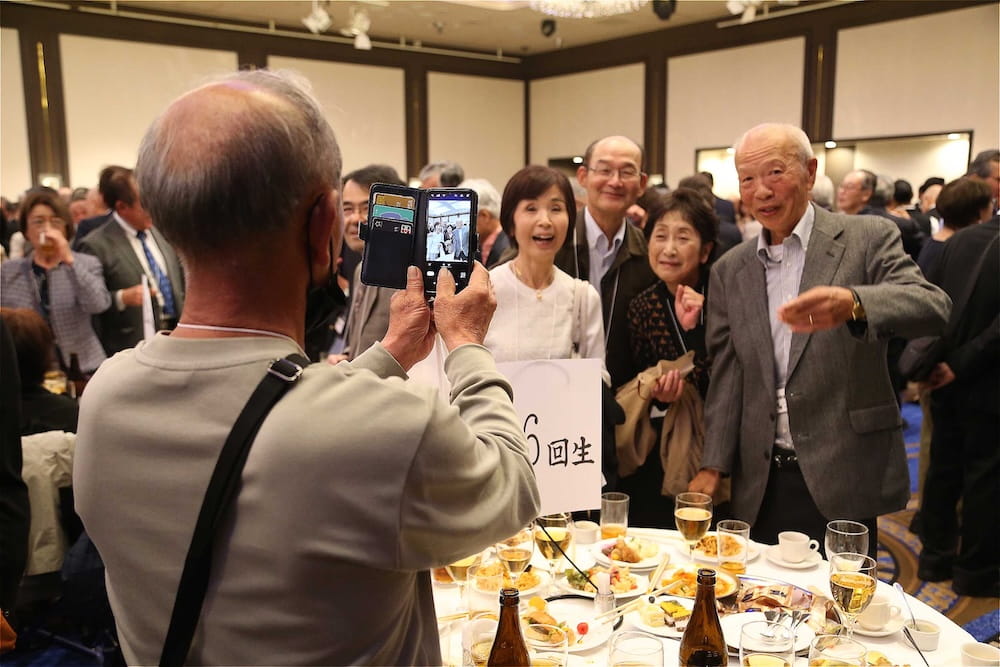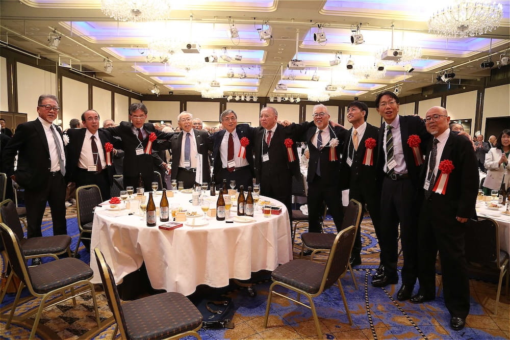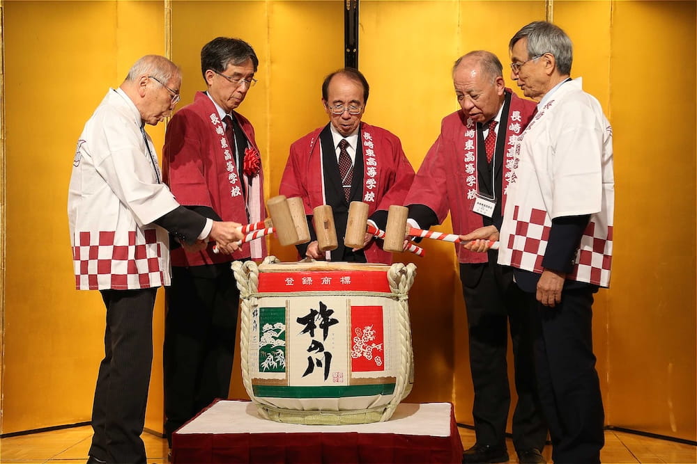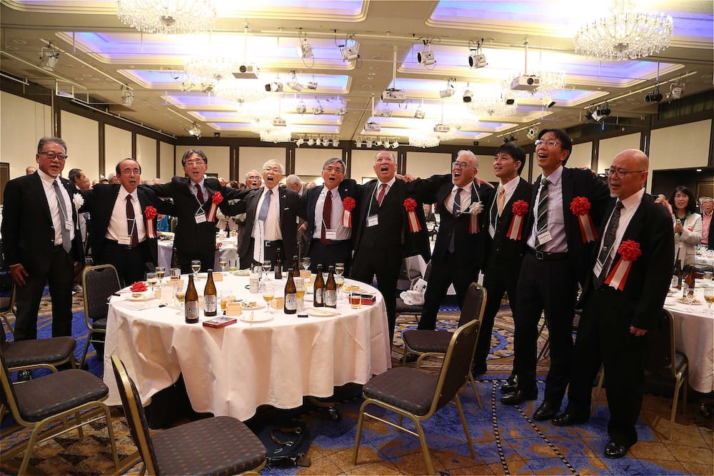 また、懇親会の冒頭、77周年を記念して鏡開きが行われ、歴代校長の米倉源蔵校長(17代、19代)、前田功校長(20代)、35回生の立木貴文校長(23代)と16回生で9代会長の手塚堅太郎さん、19回生で10代会長の波多野徹さんが木槌を握り、「よいしょー」の掛け声とともに鏡が開き、懇親会に参加した皆さんに福のおすそ分けをしました。その後、在京同窓会の北澤道也(24回生)会長が鏡樽のお酒で乾杯し、待ちに待った祝宴が始まりました。2時間の祝宴もあっという間に過ぎ、最後は19回生で10代会長の波多野徹さんの万歳三唱で7年ぶりの総会懇親会を終えました。次は、3年後の令和10年に80周年記念同窓会でお会いしましょう。