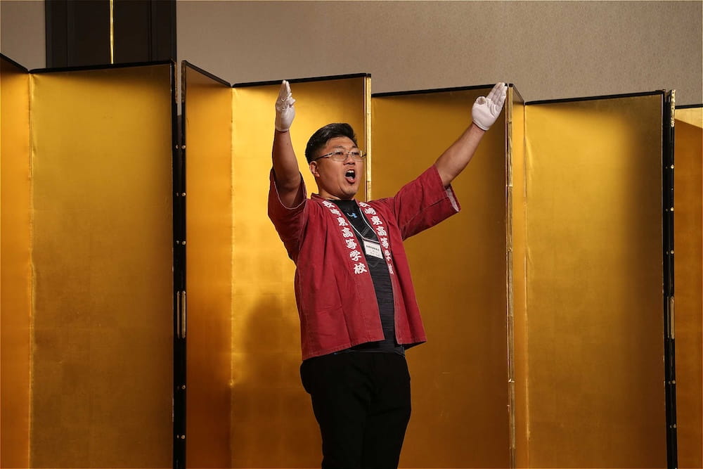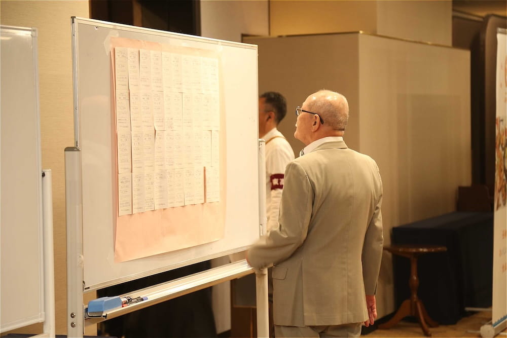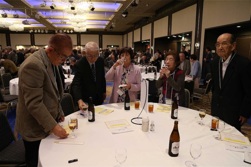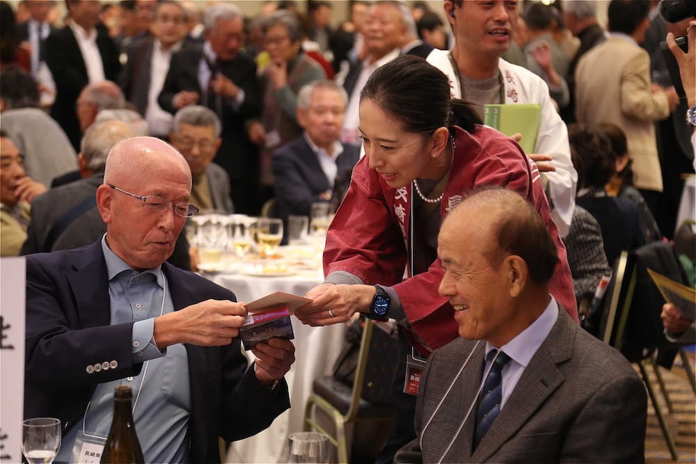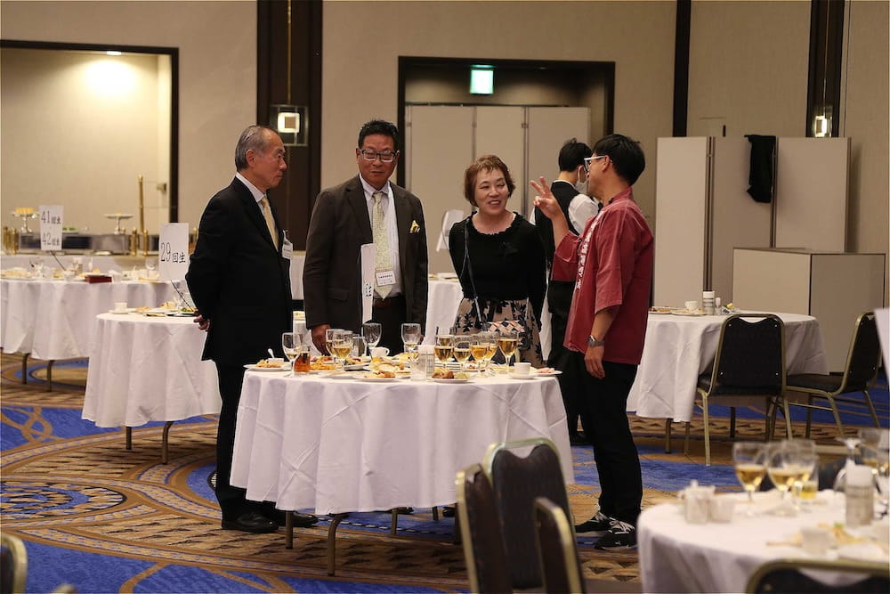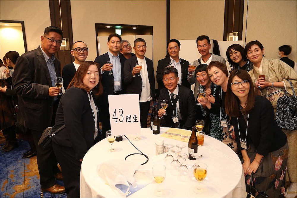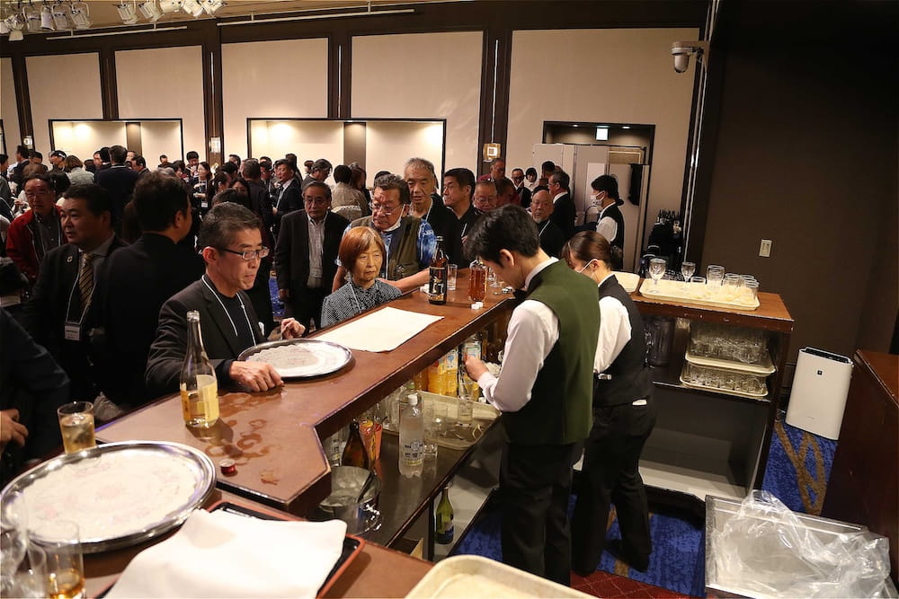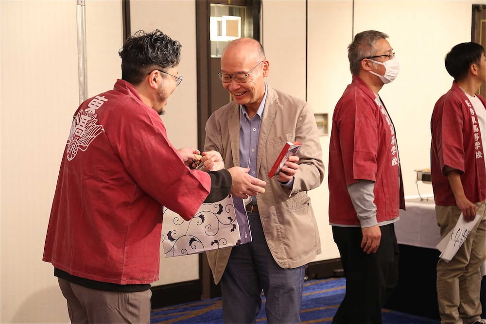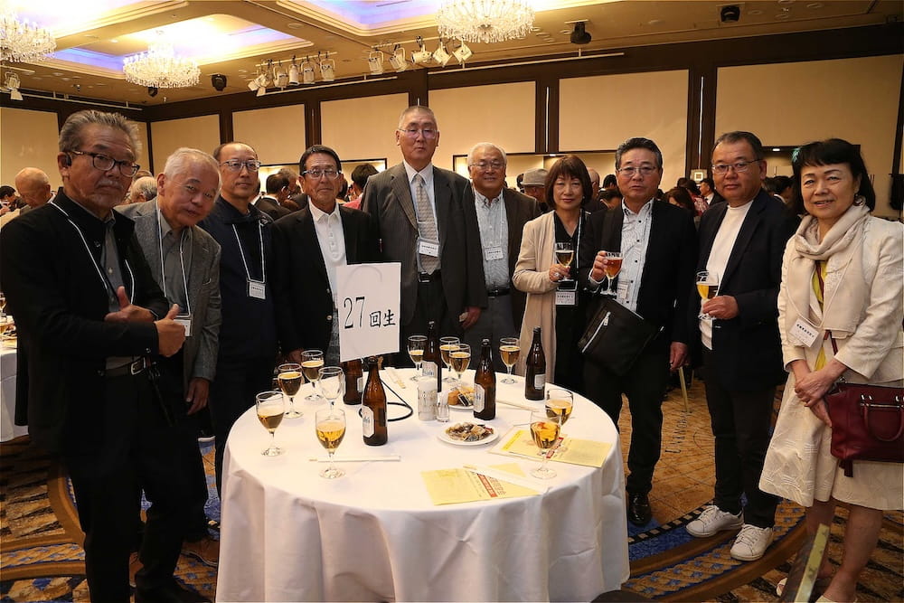 また、懇親会の冒頭、77周年を記念して鏡開きが行われ、歴代校長の米倉源蔵校長(17代、19代)、前田功校長(20代)、35回生の立木貴文校長(23代)と16回生で9代会長の手塚堅太郎さん、19回生で10代会長の波多野徹さんが木槌を握り、「よいしょー」の掛け声とともに鏡が開き、懇親会に参加した皆さんに福のおすそ分けをしました。その後、在京同窓会の北澤道也(24回生)会長が鏡樽のお酒で乾杯し、待ちに待った祝宴が始まりました。2時間の祝宴もあっという間に過ぎ、最後は19回生で10代会長の波多野徹さんの万歳三唱で7年ぶりの総会懇親会を終えました。次は、3年後の令和10年に80周年記念同窓会でお会いしましょう。