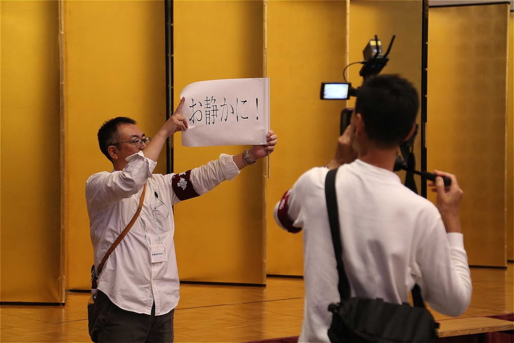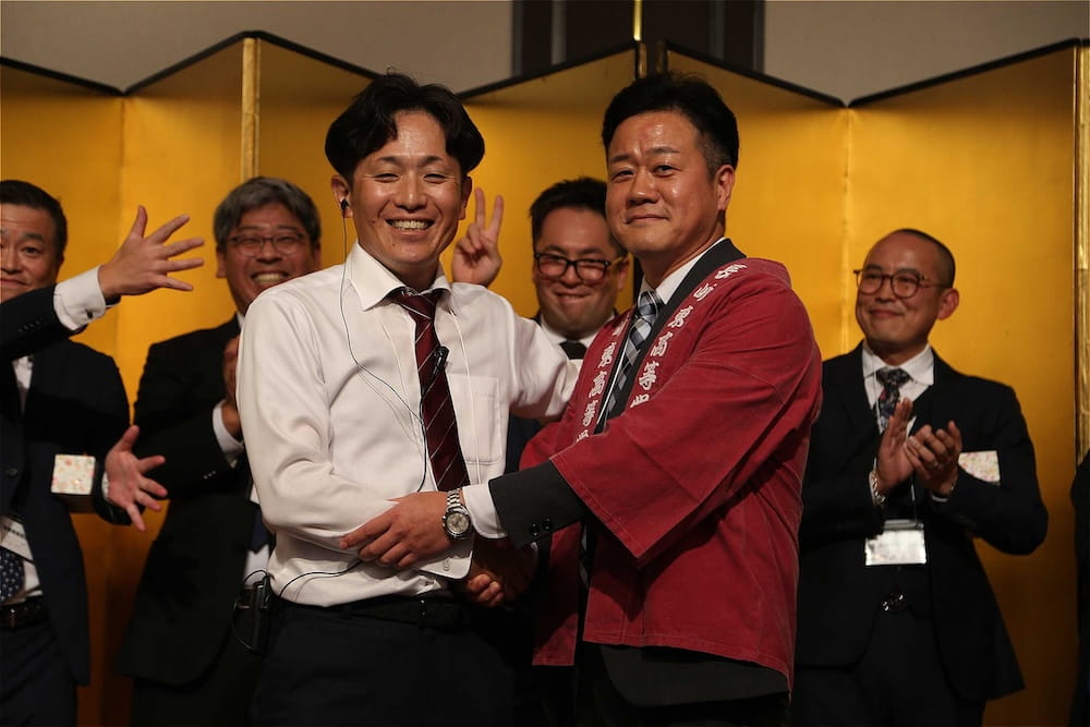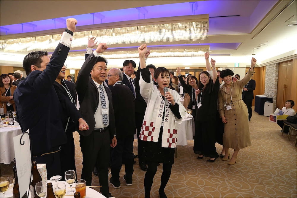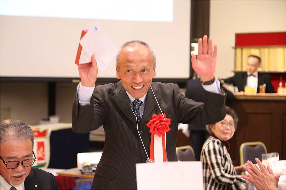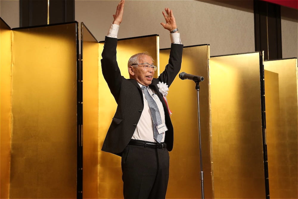 万歳三唱する波多野徹・前会長